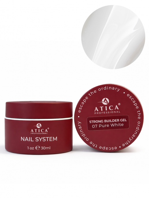 ATICA STRONG 07 Pure White to profesjonalny żel budujący o średniej lepkości, wzbogacony o mikro-włókna szklane. Produkt sprawdza się przy wzmacnianiu naturalnej płytki, przedłużaniu paznokci na formach, tipsach oraz górnych formach.