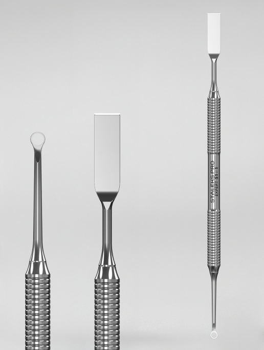 Staleks PRO Expert 51 Typ 1 (PE-51/1) to dwustronne narzędzie przeznaczone do profesjonalnej pielęgnacji paznokci. Łączy w sobie popychacz płaski prosty, który delikatnie unosi i odsuwa naskórek, z pierścieniem, przeznaczonym do bezpiecznego usuwania przyrośniętych skórek (pterygium) bez ryzyka uszkodzenia naturalnej płytki paznokcia.